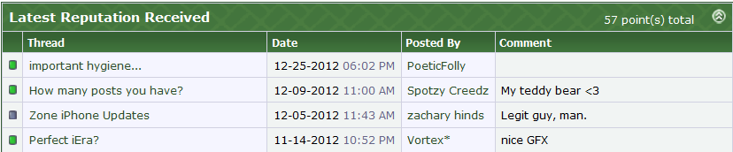 Last one was the new years resolution thread, by HON3Y BADG3R, reason being: "T". I got like, three rep today. One of them was black and I didn't get any points for it. What's up with that?