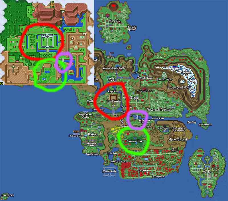 Graal map as of now has so many things in common with the LoZ:Lttp. As the woods in the far left and the circus in mod equals a blocked off path. The bottom left represents the mountains and swamp has mountains (go in swamp tower to get a better look) Top right equals sardons/onett and the path to get there. Bottom right is the ocean in destiny adjacent to the blocked off desert in graal.