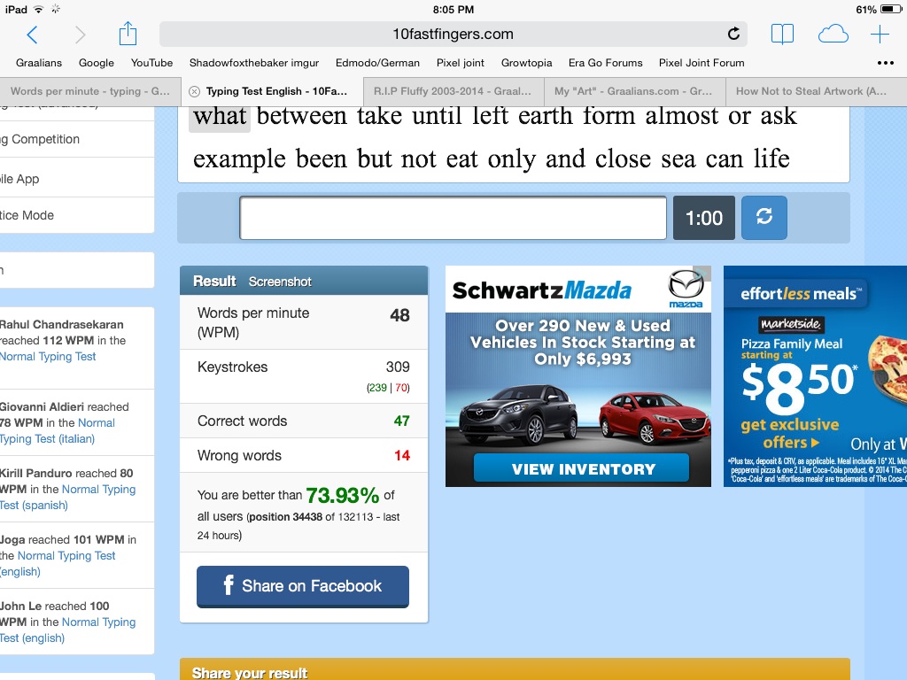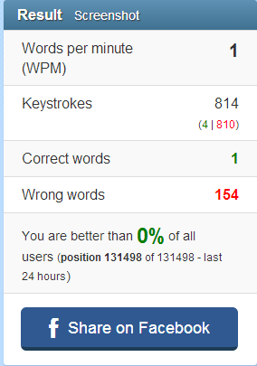 Keystrokes 271 (268 | 3) Correct words 52 Wrong words 1 You are better than 79.42% of all users (position 26746 of 129934 - last 24 hours) keep getting 79% wow cant get 80 |