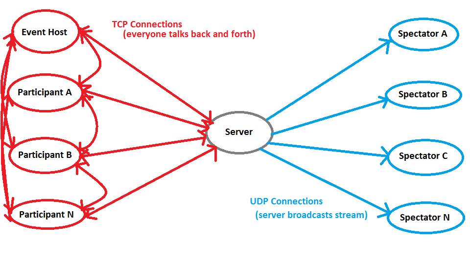 Here's a really dumbed down version. TCP is ideally 3 steps which is what happens if you leave out all the 1.1, 1.2, 2.1, and 2.2: 1. Hey other machine on the internet, can you give me this data? 1.1. Hey other machine on the internet, did you get that? I'm asking for this data. (Repeat as needed) 1.2. I saw you tried sending me a message, but I couldn't understand it, could you try again? (Repeat as needed) 2. Here's the data. 2.1. Hey, did you get the data? I'm not hearing that you got the data. (Repeat as needed) 2.2. Hey other machine on the internet, I didn't hear that! the signal's bad can you try again? (repeat as needed) 3. Okay I got it. UDP is more like: 1. Server can you give me the data? 2. Sure, here ya go, if any of the data gets screwed up on the way, I provided a means for you to figure that out. So basically what goes on with TCP connections (which everyone is using), is that there is chatter back and forth between your player, the server and other players. The more players there are, the more data being sent, the more lag. Now with events, you could maintain TCP connections for the host and the participants, and set up a client feature for spectating events that just blasts data over UDP to everyone that wants to watch, everything's just being broadcast by the server and if you get a fuzzy signal you have to live with that. That would prevent lag from the number of spectators causing issues, while at the same time making it available for viewer consumption. It's not all that different from someone running a Twitch stream alongside an MMO (minus the IRC). A crude MS Paint chart: Attachment 18048 Edit: should note that I don't know whether players game clients talk directly to one another (I speculate that they do), but it definitely increases the volume of data being transferred, in which case the lines on the left side of the graph would represent data transfer sources and destinations without intermediaries. The least trivial way to implement this would just be to have events streamed to a service like Twitch by a host (assuming they can stream a full screen version) or a bot. Doing it at the server level would be a more difficult task and would require a programmer with a background in computer networks programming. |