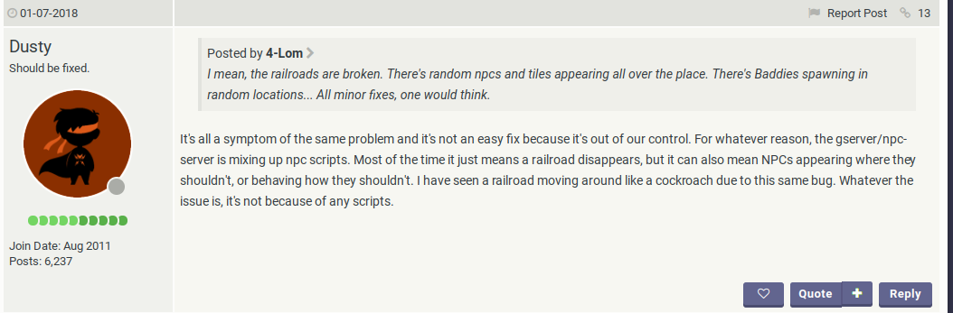 The railroad glitches seem to be occurring on the client side of people (Usually). You can tell that it is client sided since only one person seems to see a particular thing in the rails most the time. Because of this I can probably only come to the idea that this is because the server is either lagging to the point where it causes duplicate information. Or that classic 's server is lagging to the point where when the client tries to load up information from the server so it knows what goes where, It lags and puts a random object there based on your previous locations it seems. If either of these are the case, I mean personally classic should have seen this kind of issue coming |