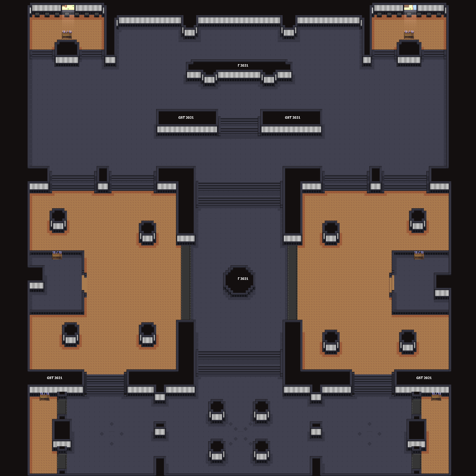 Each match of this tournament will occur in a best of 3 fashion. The GST arena has been divided vertically in 3 different sections, each representing a different round of the best of 3. The first match of the best of 3 will occur in the top-section of the map, the second match in the mid-section and if the two teams have tied at this point the third match will happen in the bottom-section. Each section is encased by invisible barriers that will keep the players from traveling from one section to another (E.g. for match #2 players can only traverse the mid-section of the arena).