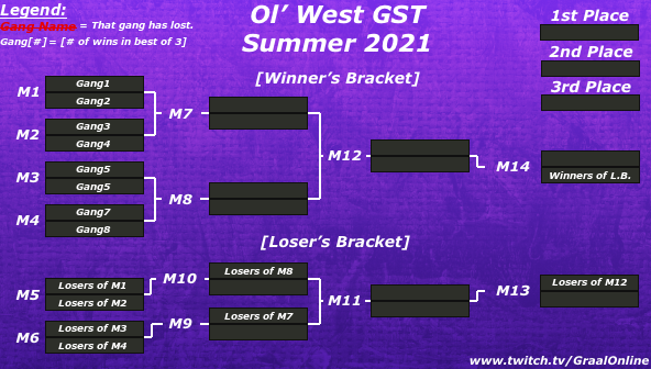 This year's GST will use a simple double elimination system. This means that throughout the event there will be two on-going brackets. The Winners Bracket and the Losers Bracket. If a team from the Winners bracket losses, they fall down to the Losers Bracket. The winning gang from the Losers Bracket will have a second chance at winning the tournament when they face the winners of the Winners Bracket at the end of the tournament. Since it's double elimination, if the gang from the losers bracket loses against the gang from the winner's bracket, that would be their 2nd elimination and thus they'd be out of the tournament. If the gang from the winners bracket losses that would've only been their first loss and thus there'd be a second match to decide who wins the tournament.
