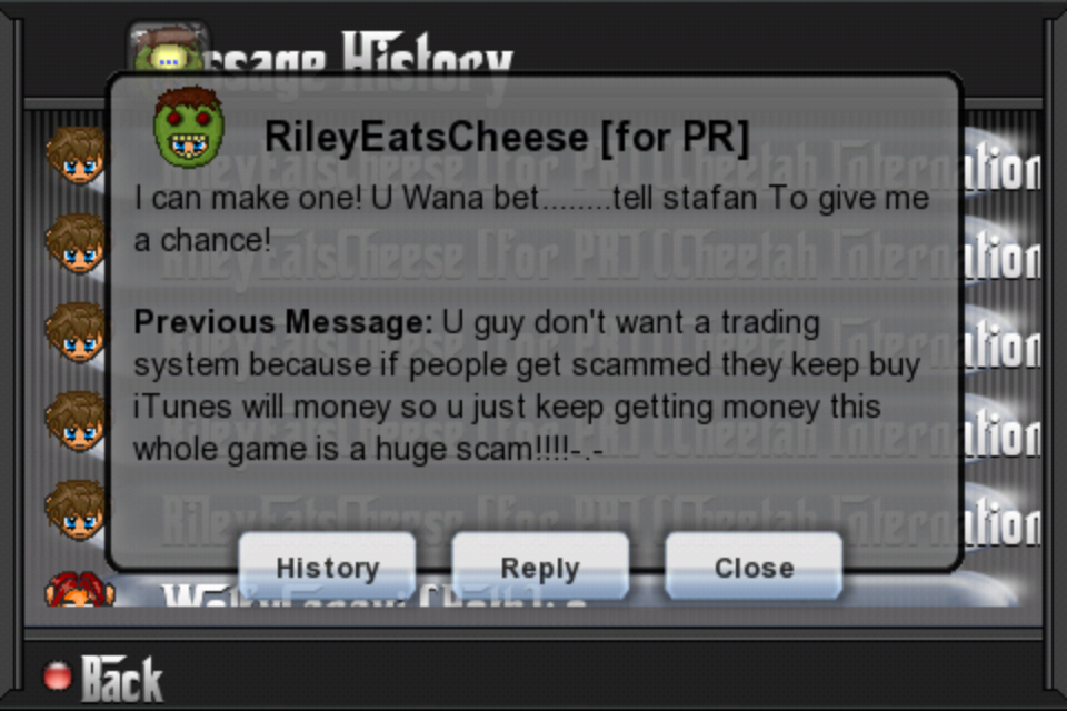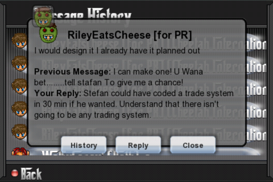 Attachment 5311 I am also going to share pictures on mine and another persons conversation as he thought he would be able to create a trading system when he would become an admin. Attachment 5312 The person, just look at his status.. And the conversation! Attachment 5313 Attachment 5314 Attachment 5315 Attachment 5316 Attachment 5317 Attachment 5318 Attachment 5319 Attachment 5320 Attachment 5321 Attachment 5322 Attachment 5323 Attachment 5324 Please remember that this conversation was only shown to show you all what kind of sick players there are, who promise others what they will do for the server when they really aren't able to do it.. Feel free to rage |