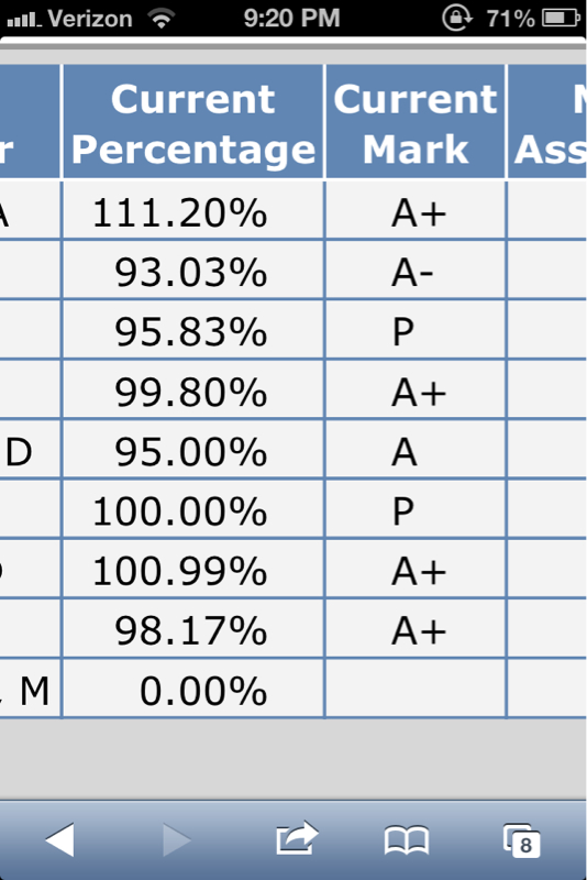 I totally agree with you on this one Higbey. Except my situation is a little different. Take a gander at my Math Grade, C. Well I ace in math... Unfortunately my class goes at an extremely slow pace, where I get it first shot. So I am sitting around for the next 70 minutes of my class (Hurray block schedule) listening to a teacher say the same thing over and over attempting to drill it into the heads of kids that aren't even listening. We actually have spent a week on one lesson, and it wasn't even a hard one. So I am falling asleep bored out of my mind, giving the same things handed the same ****ing problems everyday. Now we get a sub and he puts us in groups and it is the same thing you are dealing with, except he has the nerve to tell me I am wrong and his answer is right... So I come to my teacher asking if I could get into a class that goes at a faster pace, she says sure understanding I understand the subject, unfortunately the district or school (I don't know nor care) says that my grade is too low and that I don't understand the subject. My teacher attempts to explain my low grade but they won't ****ing listen and just go off what my grade says. Not even bothering to at least let me test to get into a higher level class. So now I can stay in my standard math class surrounded by morons. Hurray for school systems
