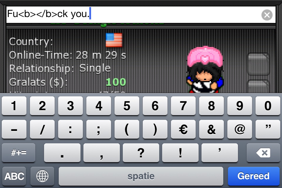 Here's another (big) glitch ![]() https://www.dropbox.com/s/dz9zox6260...%2028%2056.mov Oh and you can also use rude words in status using this (picture) Another one: you can marry yourself by marrying your second account then log in and tap transfer Graal ID: 816729 |