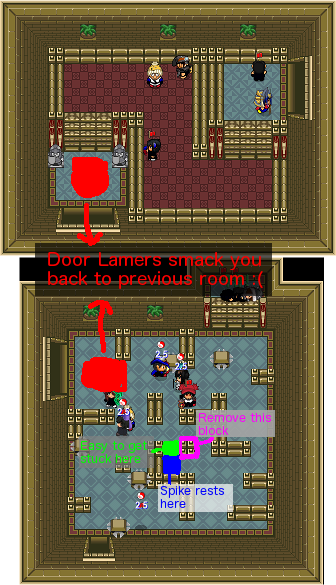 I really like it. A lot easier to get through the halls. However the trap room is a lot harder to get through without getting hit. Just a few comments. RED: This really needs to be fixed. Like Destiny, the doors are really easy to walk through. However, when people sword spam into the other side of the doorway, you get hit back into the previous room (because they hit you back onto the door's warper). They can do this repeatedly until you die (because blinking resets when you go through doors). If theyre standing in the right spot, you can't get past the doorway. Green: just a minor thing with the spike design. Its easy to get stuck in the green spot and get hammered by the spike several times because youre surrounded on 3 sides. This can be fixed by removing the purple blocks. |