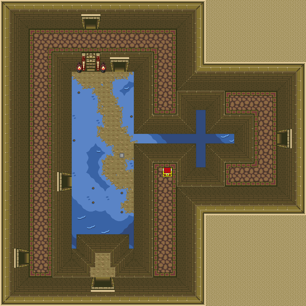 The graal of water quest, though never complete due to baddy issues and weapon issues (namely the birdshot, which is pretty much equivalent to a hookshot), did have a complete set of levels and puzzles. A lot of the clientside code was written pre-GScript2, which would no longer be supported (in contrast to the castle dungeon quest I posted about earlier). This is the first level. You get approached for help. That's pretty much the deal here. Here we see one of the first central levels, i.e. you might have ended up coming back here many times. That whirlpool shaped thing was actually replaced by an actual animation, but it was there to signify in the tiling where those would go. The whirlpool affected the players movement like you'd expect (that scripting was done). It would dump you out in another level. Here's the level it would dump you out in. The doors here would be numbered, and you'd have to keep track of them in order to complete the quest (hinted by an NPC in another level). The door you chose would be different depending on what path you took in another level. This was a path choice. It was filled with blocks that you could move, but only in the sense that depending on which way you moved the first one, you'd end up at only one of those two doors at the right side of the level. Only one of those whirlpools actually took you somewhere, but I bet on you being worried about picking the wrong one. The other would take you somewhere else, but only after the quest was complete. Here is a screenshot of the boss that I provided earlier in the thread depicting the boss battle. After the battle, you could obtain the Graal of Water (or whatever it was called). Before that, however, you'd have to get through this maze that I posted a screenshot of earlier. |
