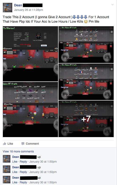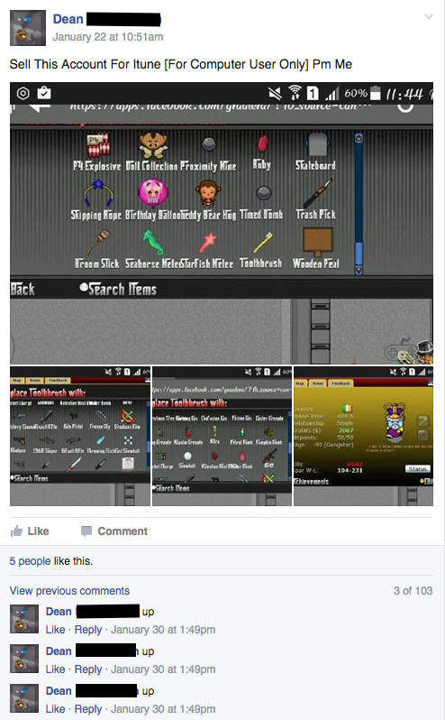 I scammed one of these people before, I asked if I can have access before I actually get the account or pay it, He said okay I'l give you five minutes. In that Five Minutes I've dropped all of his supers and rares in my house and grabbed the items on my alt, He then tried reporting me for hacking into his account, Nothing was done to me and him. This happened way back when dropping was still implemented, I've gotten a torch, some flags, and a taser, and some okay stuff from him. Note: He wont give me the password to the account upon paying, So I asked if I can access it. |