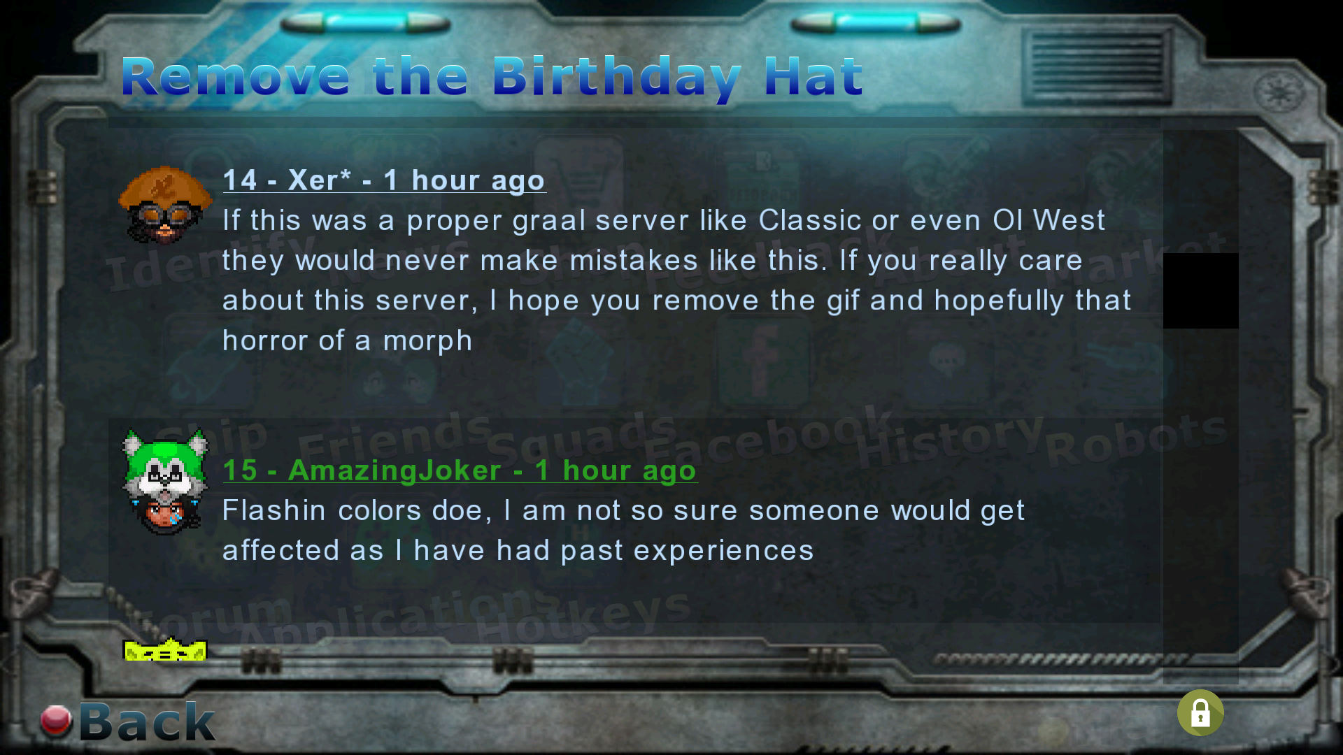 Recently for some birthday items, a hat with bright flashing colours and an eyeball with bloody and flesh hanging off it (very detailed) was added. First of all, items with bright flashing colours are not allowed to be used on graal because they can cause seizures within players who have a medical history with epilepsy. This is potentially damgerous to the health of players and even though I have asked staff to remove the hat on forums, they gave careless replies such as "don't look at it then" or "turn off gifs in settings". This is very unprofessional from these staff members as it not only shows they don't care about the health and wellbeing of players, but their lack of self awareness of the legal ramifications that can arise from this issue. As for the gory morph, alot of players have made public complaints on how it makes them feel sick and that they don't want to see such disturbing things while playing zone. Zone is a 12+ PG rated game but this horror piece is not PG and it is just a sore to look at. Dear staff, please have a screening process and select items that are only appropriate for the game. As a former graphics team member of zone I am ashamed to see things like this happen on the server I loved.