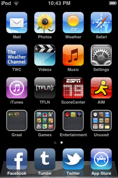 Hmmm I have: Game dev story ArtStudio DisplayRecordr SysInfoPlus iFile OpenBook Graal Classic Graal Era FFM Skype iBattery Winterboard xPod (no not porn, music) Installous Terminal Cydia ScreenRecorder Backgrounder Make it Mine IM+ Netflix<3 Soundboards (Eric cartman, like a boss, more) Slots Fruit Ninja Tetris Cartoon Wars 1 Cartoon wars 2 Death worm Shave me? ( lol)PAC-MAN Mega Worm Gun Builder Sky Combat Boot Camp Zombie GS FS5 Hockey iGun Pro DoodleJump Touchgrind Cube Runner And thats about it. |