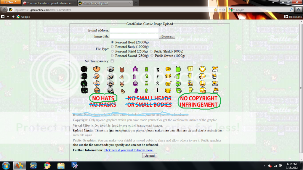 I disagree with all the rules...First I mean come on you won't die if someone makes a custom hat anyway.....For ****s sake its 20k!! Thats actually a good deal for them...and copyright infringement ....Oh okay Pokemon(Example) Is tooootally gonna find graal and gonna sue just because a player made that as their custom look...and transparent head...I can see it clearly,I know somebody that has NO HEAD...its missing! And i can still see him...Small heads and small bodies dont fit graals graphics? So what,what's the wrong in being special??? And sorry for this little rant it was just pissing me off....