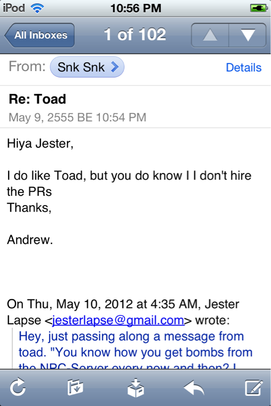 Email sent to snk: Hey, just passing along a message from toad. "You know how you get bombs from the NPC-Server every now and then? I gave my bombs that I got one day to a good friend. Only about 50, so it wasn't much. Then, when I tried to come back they wouldn't let me due to giving away items. Which are free anyways, I just gave mine, like any other player would. I think this situation was odd and I deserve another chance, however none of the staff respond to me which makes me pretty angry since I've done a lot of work for the server." This is toad, an ex PR who got fired for I feel a silly reason. Now I know that I should not be telling you how to run your server, but I think you should hire him again especially since Noah just got fired. Toad helped me out a lot back in the day and did his job to the fullest. Please reconsider hiring him back or at least giving him some closure. Best Regards, Jester Lapse |