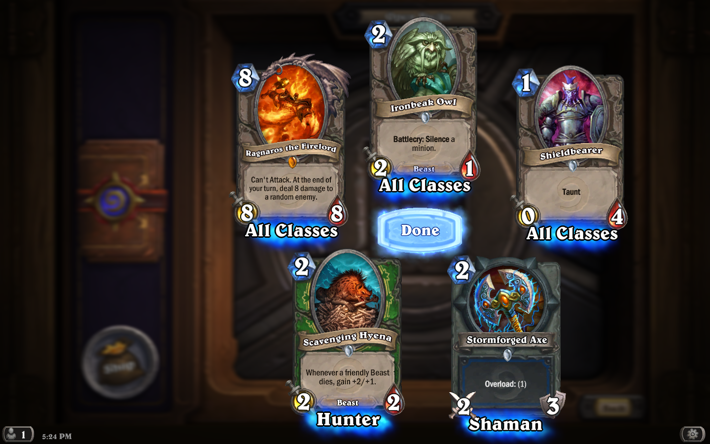 have opened 82 packs, somehow only managed to get 2 Legendaries out of them (terrible ones in this meta, Tinkmaster and Cairne) was lazy today and decided to just straight-out buy 2 packs instead of do an arena run and got 1 in each of them Noz is awful, but thank goodness I finally got Rag |