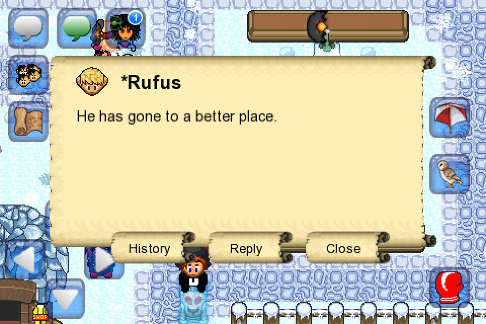 why?.... WHY?! Bernart is just about the only notable NPC in iClassic... and he left his cozy bench and facinating statue for a cup of eggnog?!