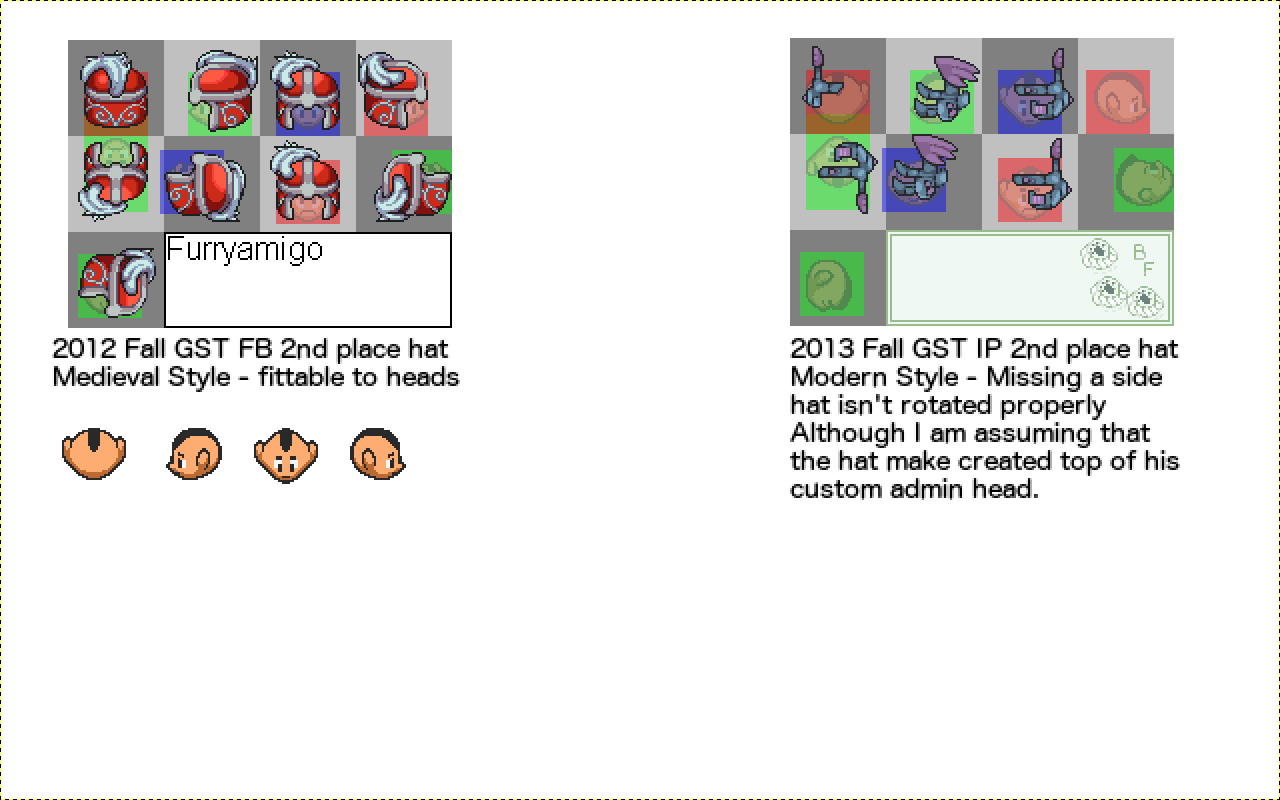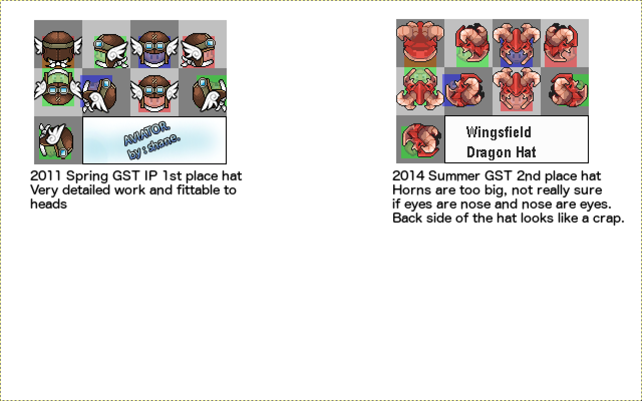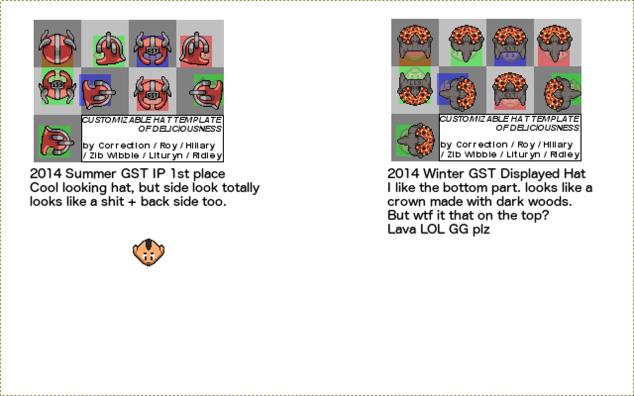 Thank you GraalSun from IG for having a picture of old GST hats from CrimeWatcher's GH. The first Image is just an image without any watermarks. The second image is just me judging all the previous GST hats. The ones with 'X' are hats that look ugly to me. However they still fit nicely on any normal heads (no over sized hats, side view looks great). Rest of them looks amazing/fine/great. If I won GST and had to make a decision, I'd pick the ones with 'X' marks over the latest GST hats. THAT'S HOW LAME IT LOOKS IMO. |