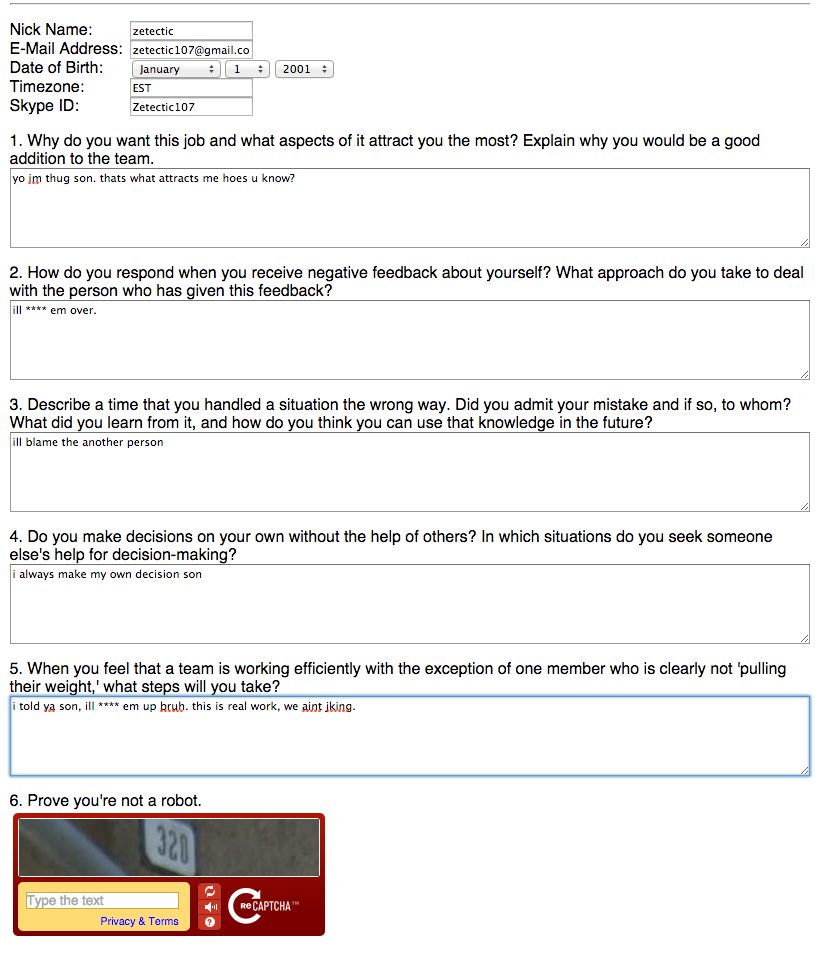 http://graalonlineclassic.com/gpapp.php I've tried in numerous browsers and attempted over 20 different captchas, and no matter what: "We think you might be a robot, if not please go back, refresh the reCaptcha and try it again." I noticed that when I click the button to submit, the captcha changes quickly before the next page loads. Anyone else having this issue? Not sure where else to post this. |
