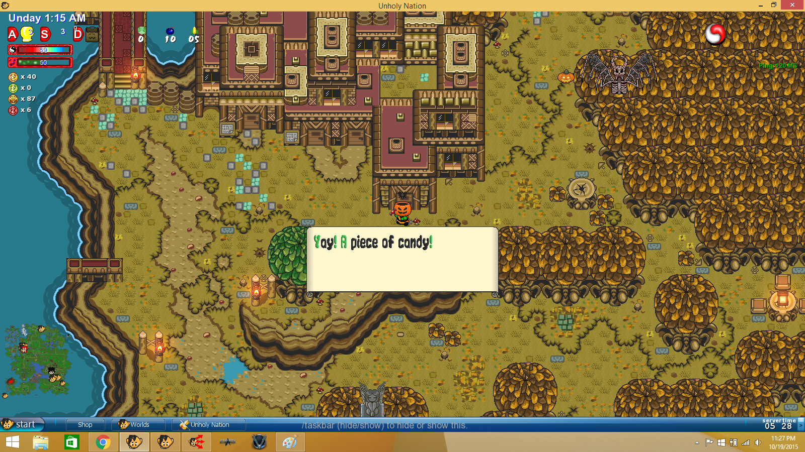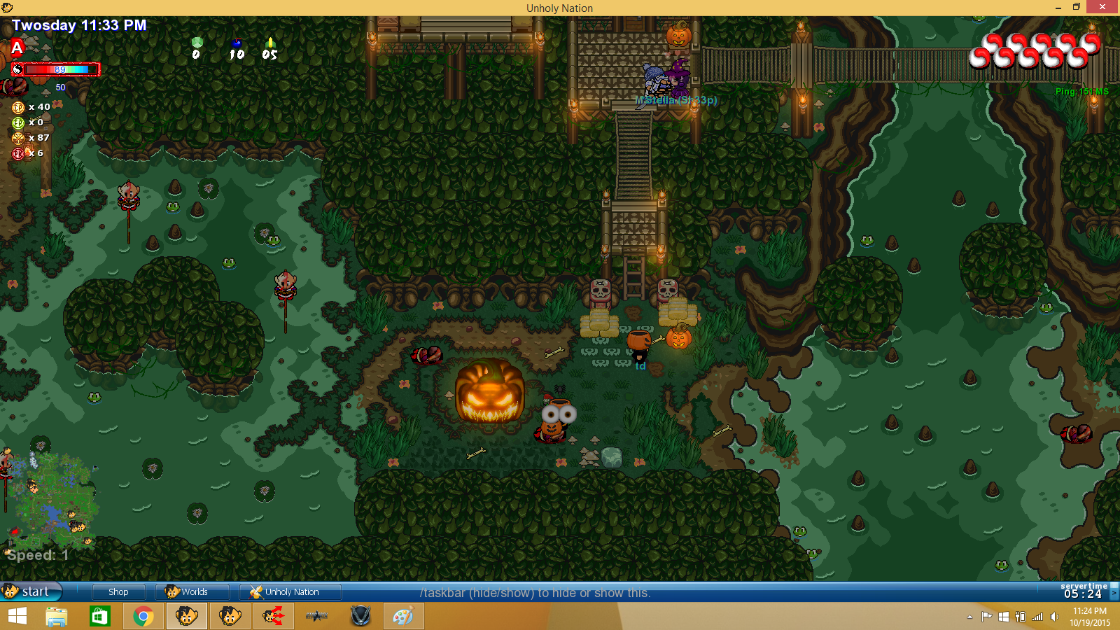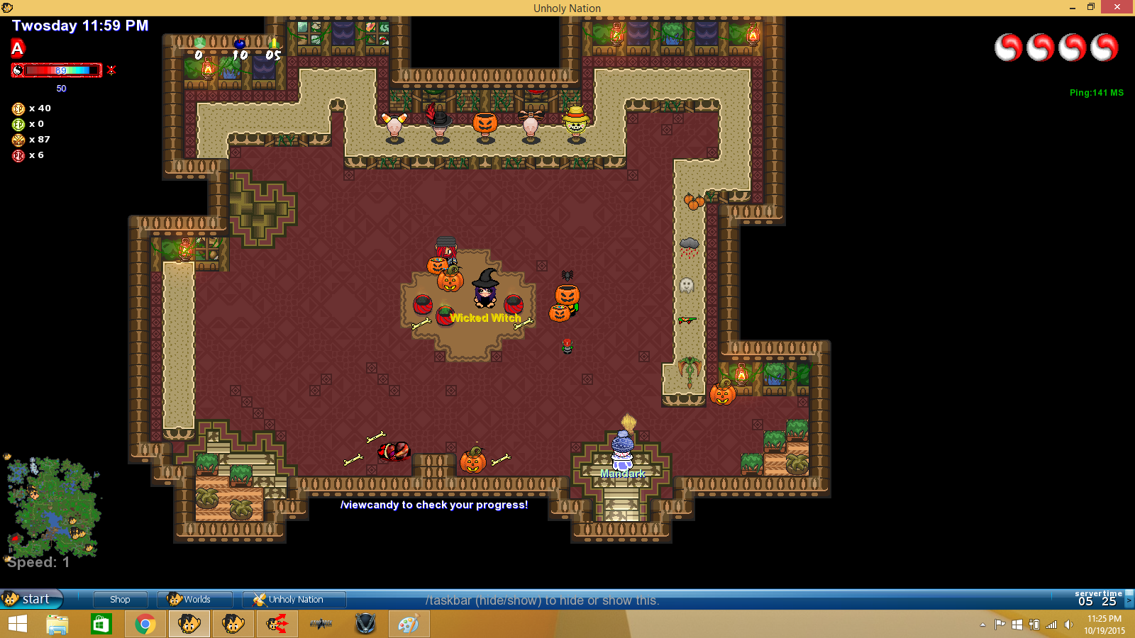 Good evening everyone! Happy (almost) Halloween! To kick off events this year, a Wicked Witch south of the town Tarran has opened up her shop hoping to get players to trick or treat for her! In her small swamp shop shes handing out Candy Bags to get you started, but she isn't handing out everything for free! If you have any questions, please feel free to direct them or our lovely FAQs! Hope to see you guys enjoy Halloween on Unholy Nation!! If you do not know how to log on Uholy Nation, all you have to do is goto graalonline.com, create an account (If you don't already own a PC Graal account), download the Client, log onto Unholy Nation!! -Unholy Nation Staff |