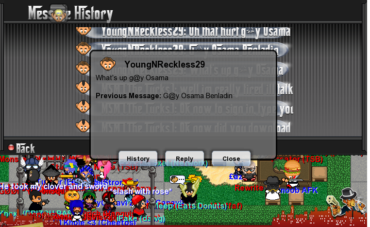 Racism in Graal is the main reason why I don't have a country chosen. I'm half German and get called a Nazi and Hitler's son, when I choose the German flag. I experimented and this is the outcome when I make myself: English: Omg go brush ur teeth and gt a appointment at the dintal clenic lol, u guys suk. African American: The 'n' word. |