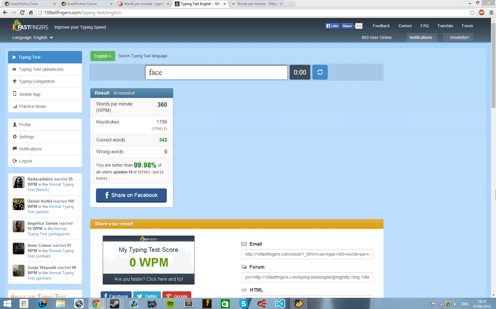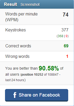 Keystrokes 271 (268 | 3) Correct words 52 Wrong words 1 You are better than 79.42% of all users (position 26746 of 129934 - last 24 hours) keep getting 79% wow cant get 80 |