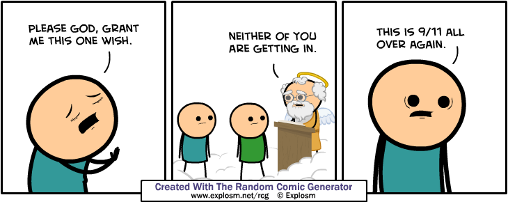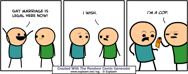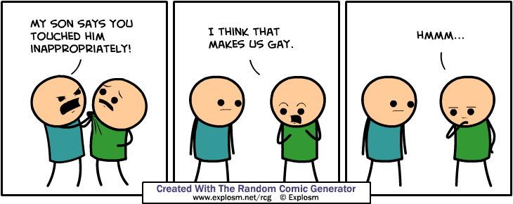 Been playing around with the Cyanide and Happiness Random Comic Generator and been getting some pretty hilarious stuff. http://files.explosm.net/rcg/ntskprrdu.png http://files.explosm.net/rcg/gcephncer.png http://files.explosm.net/rcg/usdfmgpmq.png http://files.explosm.net/rcg/mvxehodxj.png http://files.explosm.net/rcg/ptaypqslb.png http://files.explosm.net/rcg/wjiyqgvqx.png Post the ones you made from this site: http://explosm.net/rcg |
