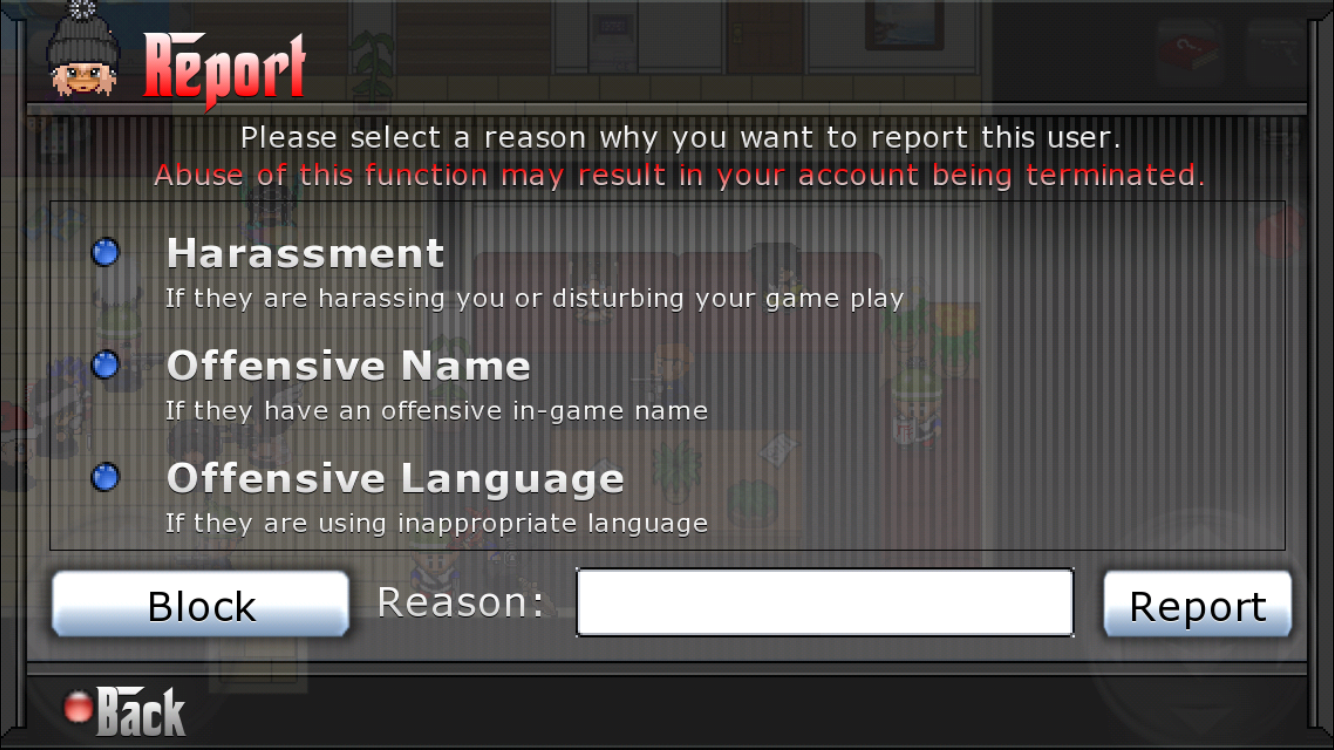 Classic should really have this type of report system because: 1. It's simplistic and user-friendly 2. It has the reasons listed saving both players/admins time 3. States if a player abuses/false reports, they will be warned Example: Subject: Offensive Behavior Reason: This player is swearing and writing explicit messages. |