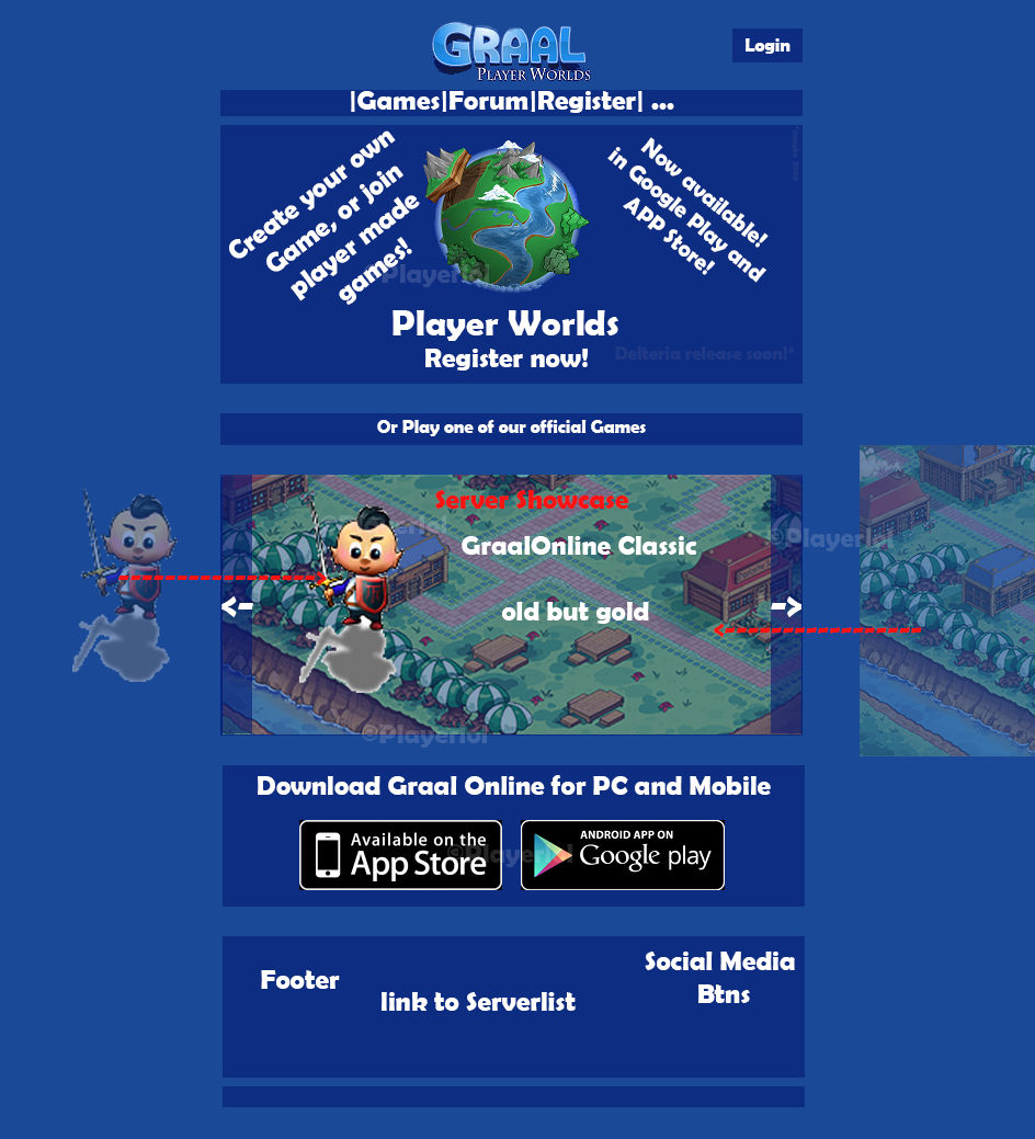 This design focus on Graal Worlds because in my opinion Graal Worlds should be the main focus for the future. It also makes no sense to show images of different servers exactly next to each other. The different art and gameplay styles make the website look like a mixture of not matching images. Like the example picture in the post. It hurts the eye. So we keep it simple and clean with introducing Graal Worlds first and a few servers, one at a time, in the slider below.