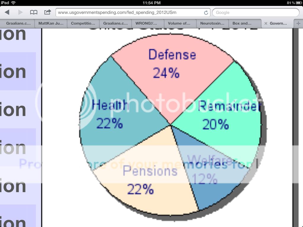24% goes to defense contracts. All of these services now were regulated much much long ago. The Internet shaped how we acted. ![]() http://www.usgovernmentspending.com/...nding_2012USrn We spend 24% on fighting small countries with little or no aid and terrorists huddled caves. * Total Spending $3.8 trillion * * Pensions $0.8 trillion * * Health Care $0.8 trillion * * Education $0.2 trillion * * Defense $0.9 trillion * * Welfare $0.5 trillion * |