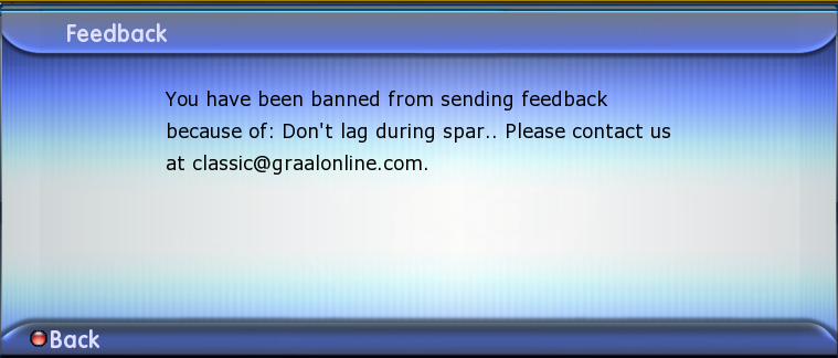 I wish you had a picture of the message you sent, but I know people don't take pictures of everything they send in feedback. Being banned from feedback for lagging from spar is abuse of power if this is true. I can't check what you sent so I really don't know what to think of this.