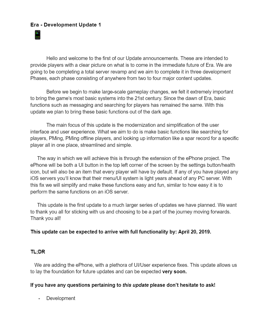 Hi all, For those of you interested in and/or following the Era PC rebuild, here are our update notes/planned features for our first large update. Please feel free to ask any questions pertaining to this update. Hope to see some new and familiar people online in the future! |